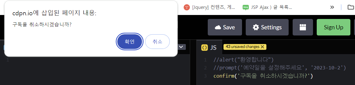 prompt 입력 받음 어떤 값을 입력 받을 때 사용함 두번째 인자값에 넣어주면 디폴트값으로 설정되어 볼 수 있음