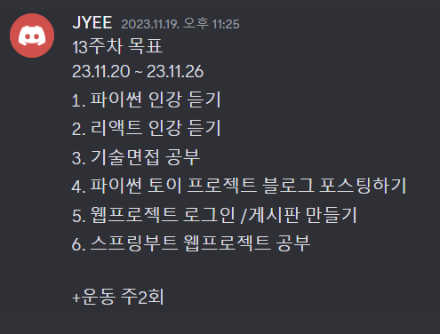 | [온라인스터디 12주차] 11.13 ~ 11.19 공부 기록 및 후기 (2) | 2023.11.19 |