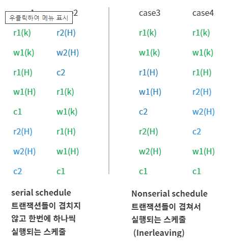 여러 transaction들이 동시에 실행할 때 각 transaction에 속한 operation들의 실행순서이다.