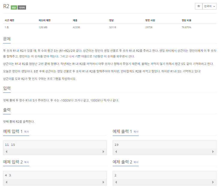 두 숫자 R1과 R2가 있을 때, 두 수의 평균 S는 (R1+R2)/2와 같다. 상근이는 정인이 생일 선물로 두 숫자 R1과 R2를 주려고 한다. 생일 파티에서 상근이는 정인이에게 이 두 숫자를 말해주고, 정인이는