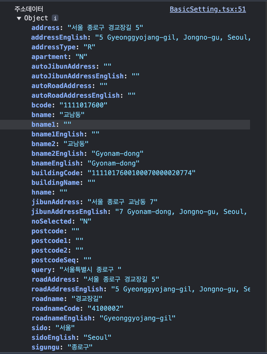 여기서 나는 필요한게 주소 address/roadAddress랑 우편번호인 zoneCode 였다.
