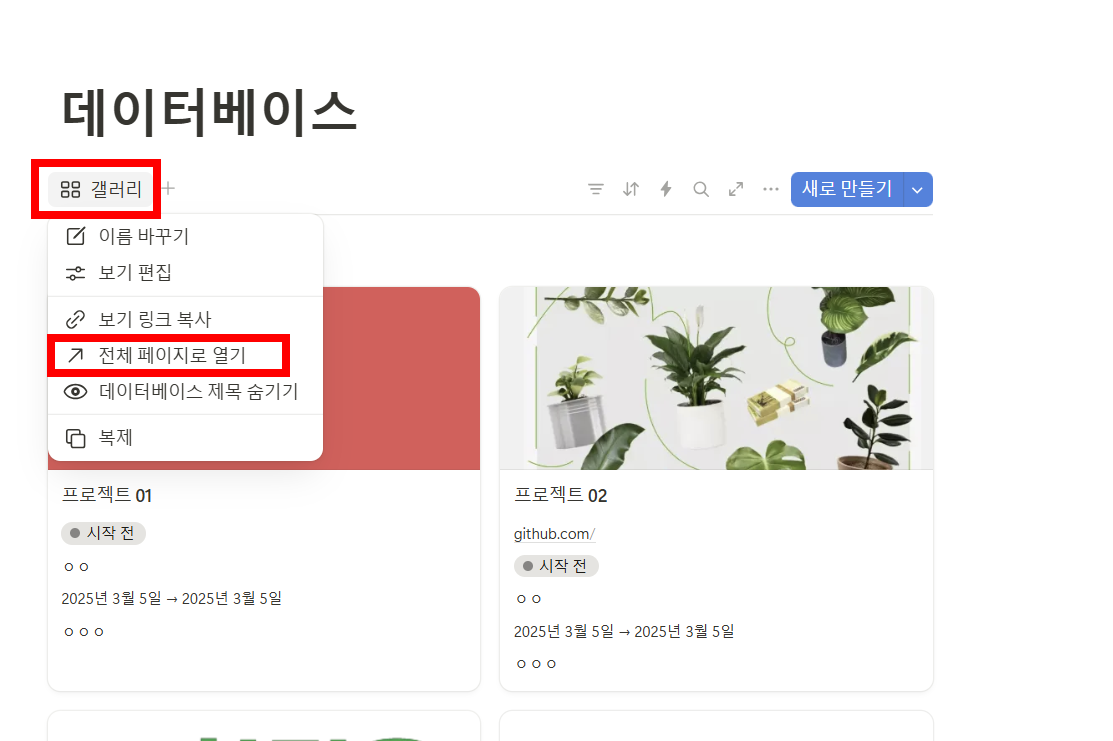 노션 데이터베이스 만든 페이지로 다시 돌아가서 갤러리를 클릭하고 전체페이지로 열기를 꼭 클릭해야한다.