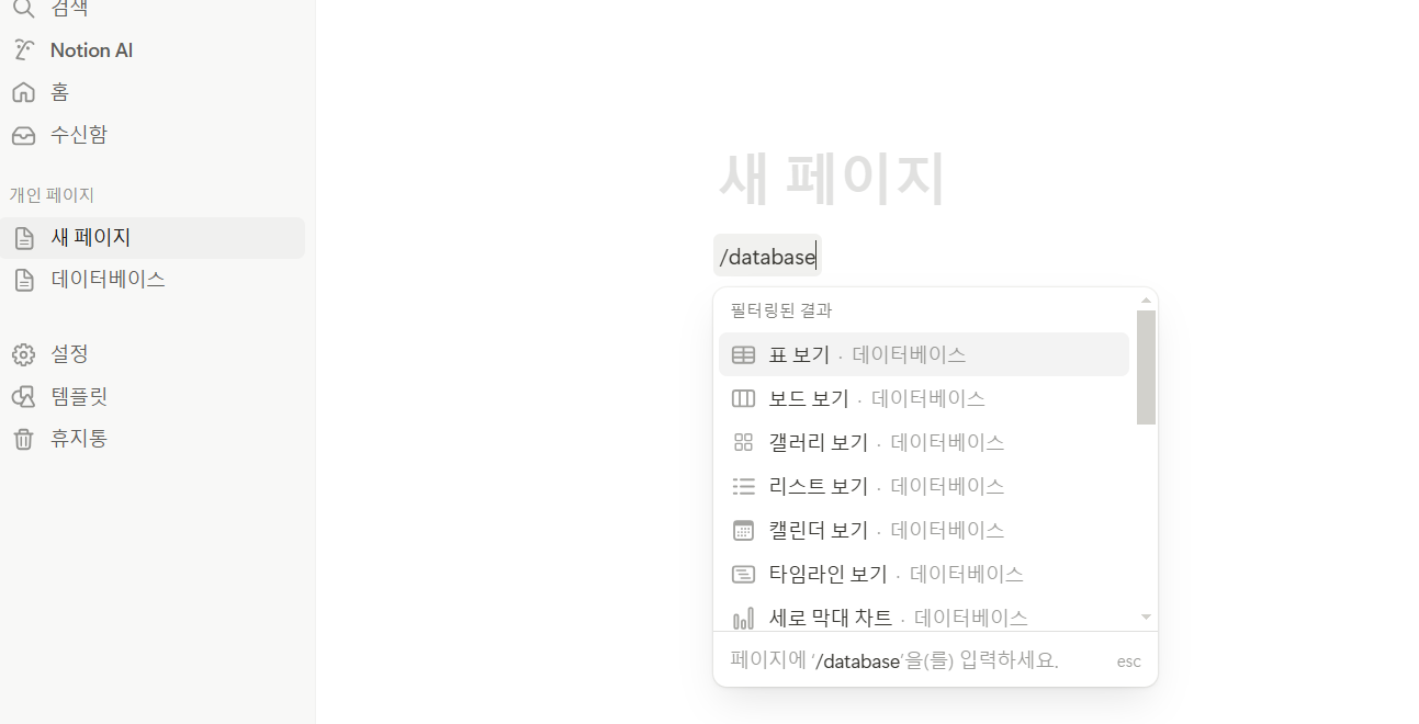 노션에서 새 페이지 생성해서 /database로 데이터베이스를 만들어주면 된다. 나는 database-inline을 선택했다.