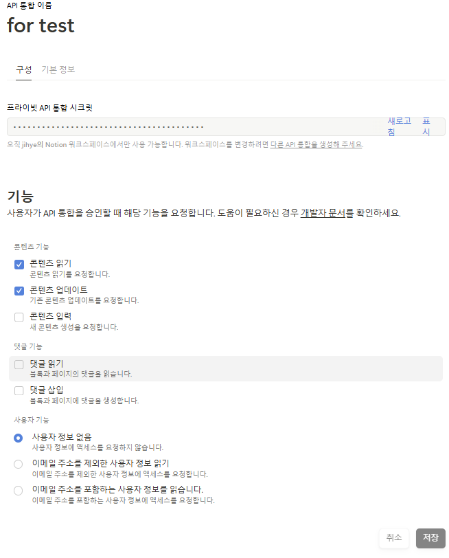 통합api 시크릿 코드인 access token과 database ID (notion-version: 2022-06-28 인 경우 참고) 이 있는데