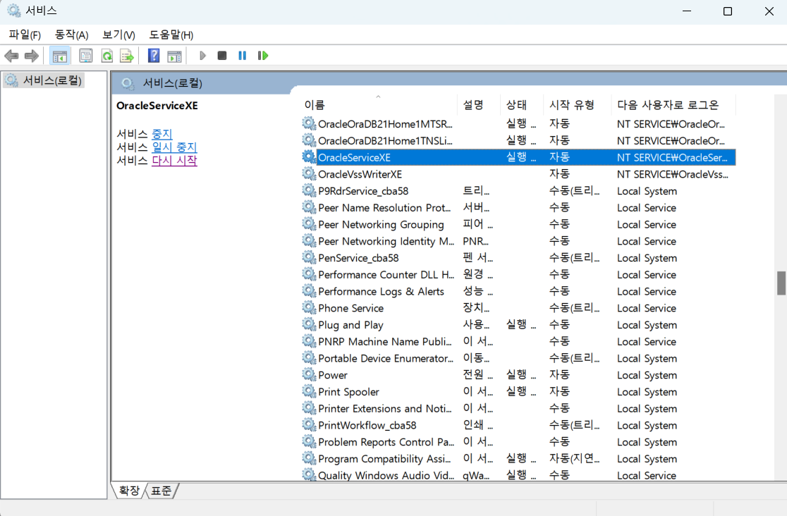 그러면 이런 창이 뜨는데 여기서 OracleServicesXE를 누르면 된다.