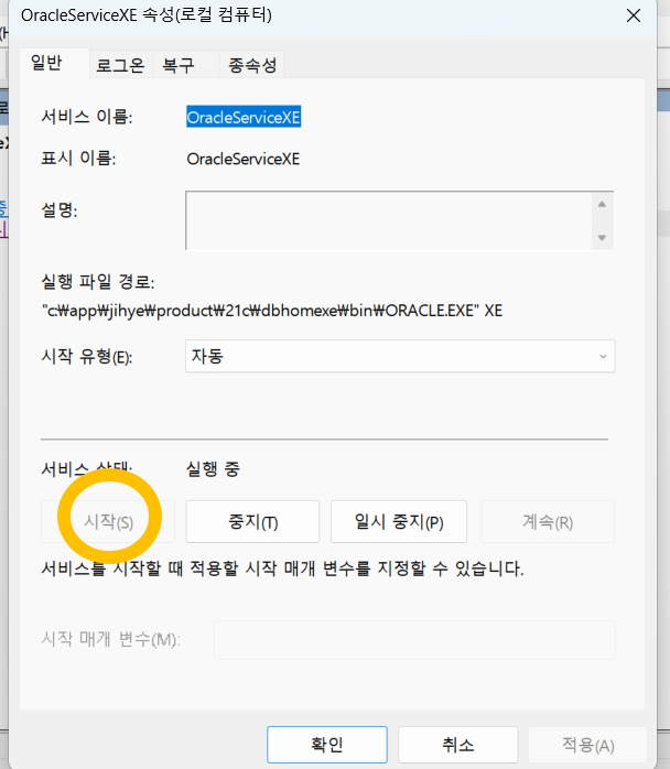 누르고 서비스 상태가 실행이 되어있지 않으면 실행 중으로 바뀔 수 있도록 시작을 눌러주면 됨