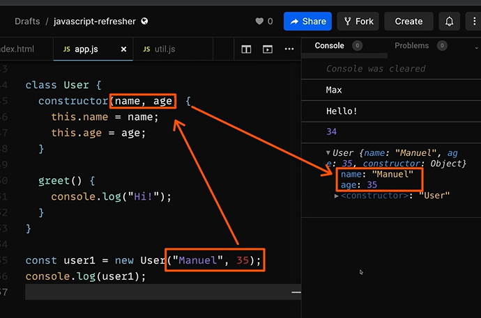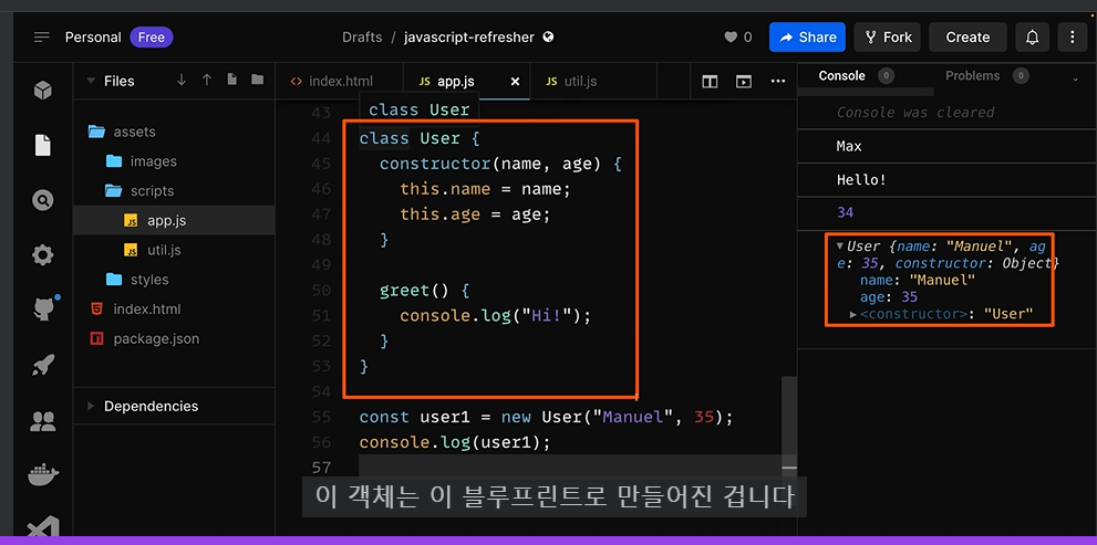 여기서 출력해낼 때 console.log가 없이 user.greet()만 나오는지 궁금해서