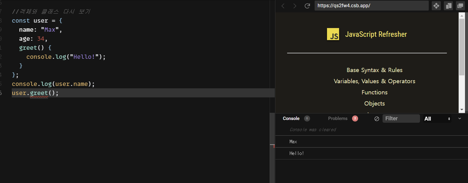 conseol.log(user.greet()); 가 undefined를 반환해서 그렇게 나온거 같다.