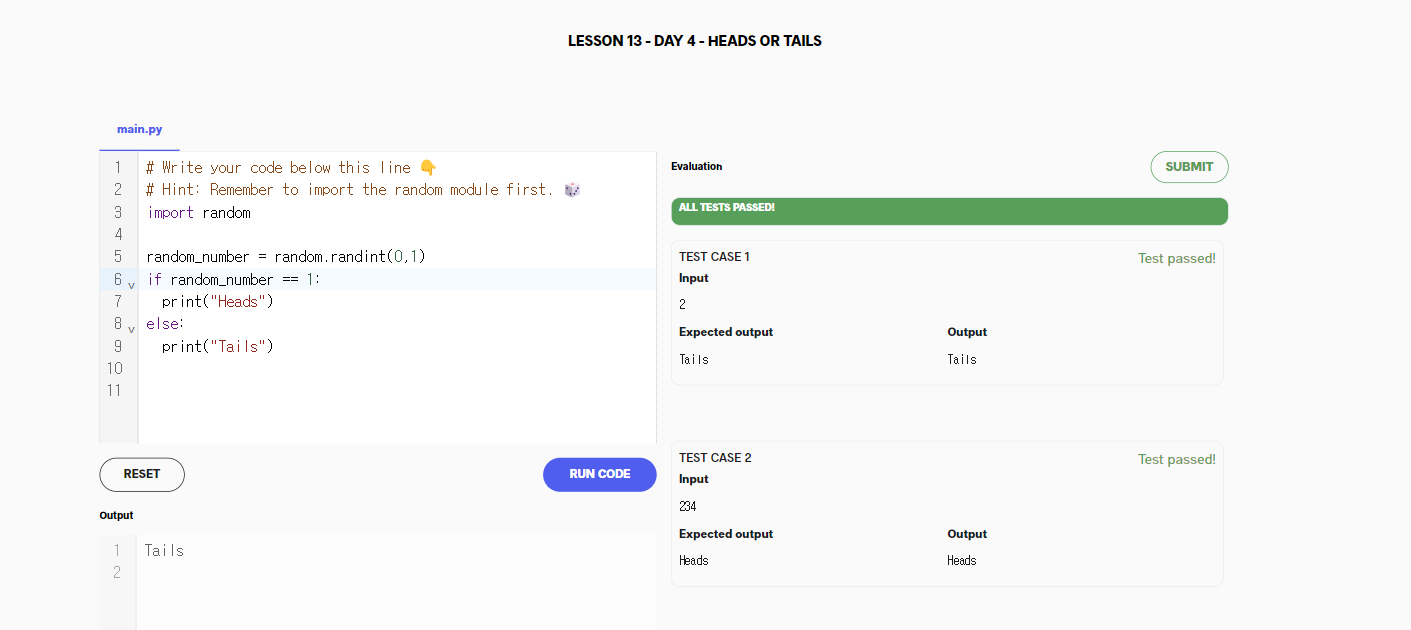 There are many ways of doing this. But to practice what we learnt in the last lesson, you should generate a random number, either 0 or 1. Then use that number to print out "Heads" or "Tails".