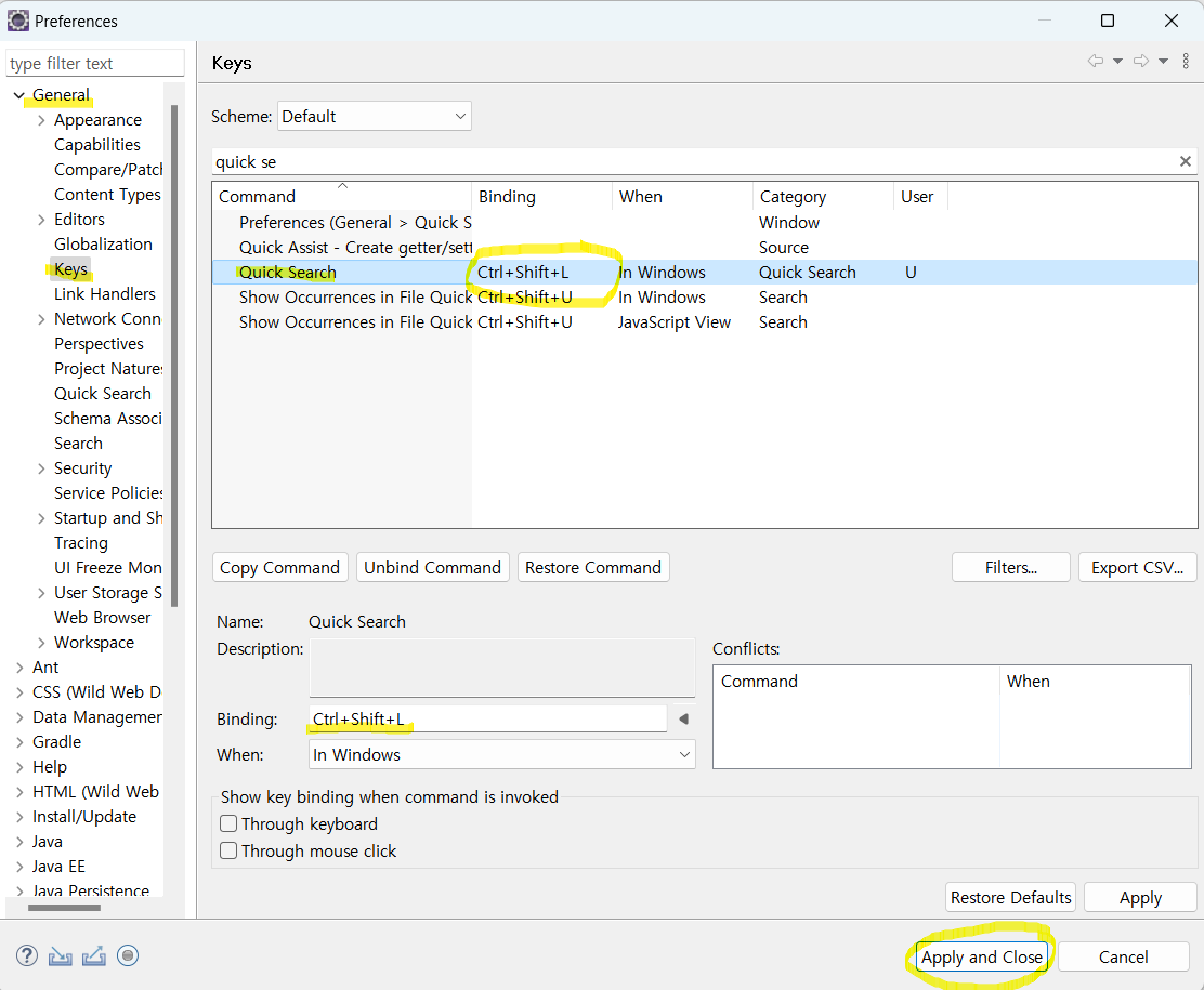 General -> Keys 검색창에 quick search 검색하면 이미 설정된 단축키가 있는데 Binding 탭에서