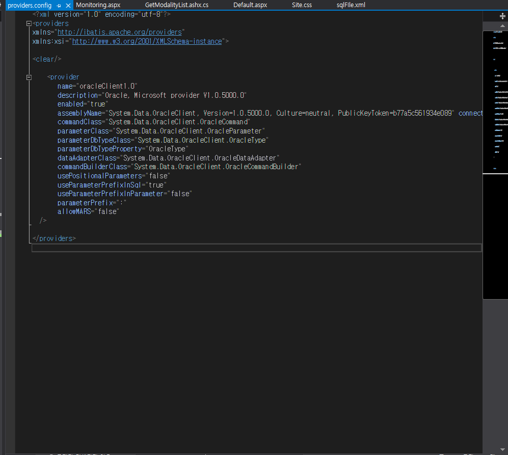 최상단에 배치된 providers.config를 수정하자면, 안에 여러개의 provider이 들어가 있는데 나는 사용할려는게 oracleClient1.0이였기에 이것만 남기고 나머지는 삭제해버렸다.