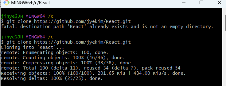 명령어 입력: git clone 레포지토리 주소